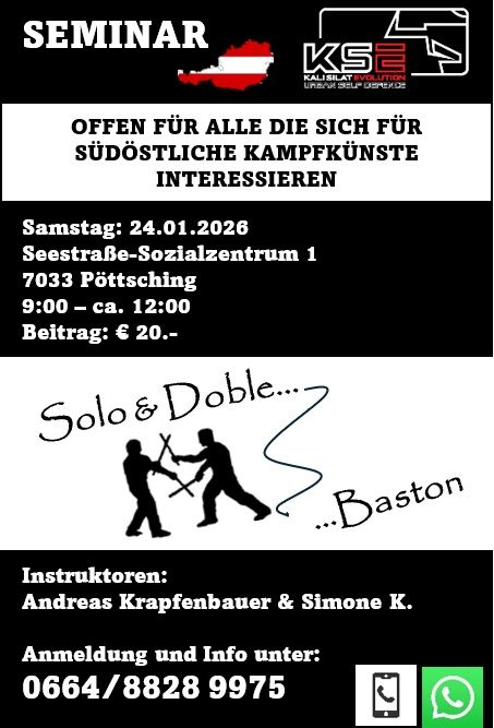 KSE-AUSTRIA Seminar Trainiere Koordination, Beweglichkeit und Selbstverteidigung in nur einem Vormittag. Egal ob Anfänger oder Fortgeschritten – Spaß und Lernerfolg garantiert. Samstag, 24.01.26 Sozialzentrum Pöttsching Anmeldung & Info 0664/8828 9975 + Zu Google Kalender hinzufügen + iCal / Outlook exportieren Datum 24. Jan.. 2026 Uhrzeit 09:00 - 12:00 Preis €20.00 Standort Sozialzentrum Pöttsching 7033 Pöttsching, Seestraße-Sozialzentrum 1 Veranstalter Andreas K. & Simone K. Telefon 0664/8828 9975 Webseite https://www.facebook.com/andreas.krapfenbauer.5